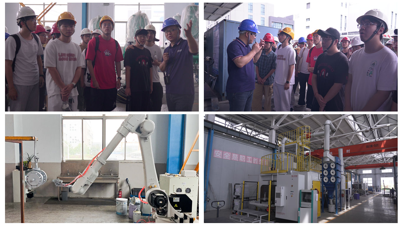 在参观环节,师生们走进良时智能的工厂车间,近距离观摩了各类先进设备的生产与运作过程。车间内,用于阀门喷涂的AI智能免编程喷涂机器人正在精密的测试中。另一台适用于航空精密零部件的双机器人数控喷丸强化设备正在安装调试,它采用了双机器人多枪协作技术,展现出高度的自动化与智能化水平。师生们不时驻足观察,对设备的精密构造和高效性能啧啧称赞,更直观地感受到了良时智能在技术研发与生产制造上的实力。